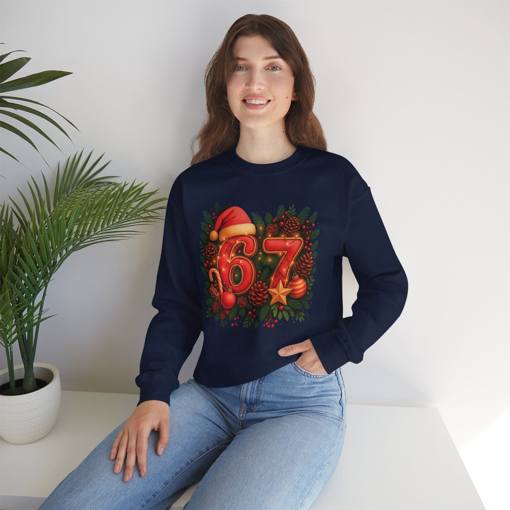 This cozy crewneck brings a warm, homemade holiday vibe to chilly evenings. Soft, medium-heavy fleece holds a rich, festive print—ornaments, pine cones, berries and a Santa hat framing the bold “67”—so the design reads like a stitched memory from family traditions. The classic fit and ribbed collar sit comfortably for layering over shirts or under coats, and thoughtful construction (tubular knit, reinforced seams, tear-away label) keeps it feeling lived-in, not worn-out. Wear it while trimming the tree, passing out cookies, or settled by the fire with a mug in hand — it adds a quiet, nostalgic note to the season.