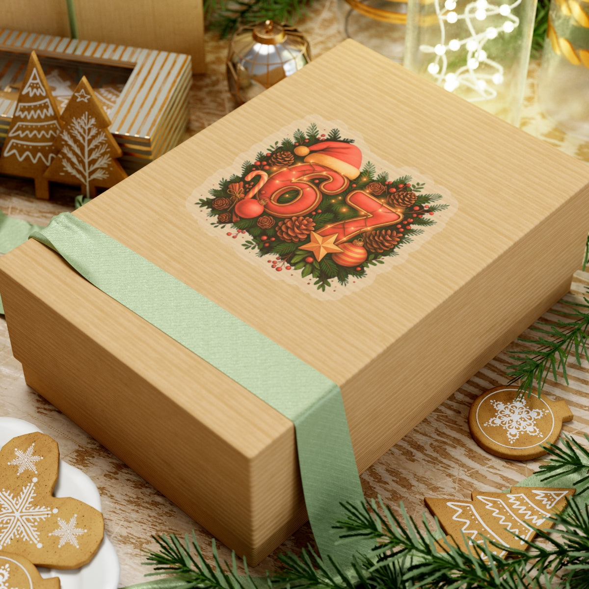 A festive kiss-cut sticker that brings cozy holiday cheer to everyday items. Deep evergreen sprigs, pinecones, candy cane accents and glowing red-gold numbers are arranged around a plush Santa hat and twinkling lights. The glossy finish makes colors pop and gives a scratch-resistant surface that holds up on laptops, journals, phone cases, and gift wraps. It applies smoothly and stays put on clean, flat surfaces — a small seasonal detail that brightens a workspace, travel gear, or a package for a loved one.
