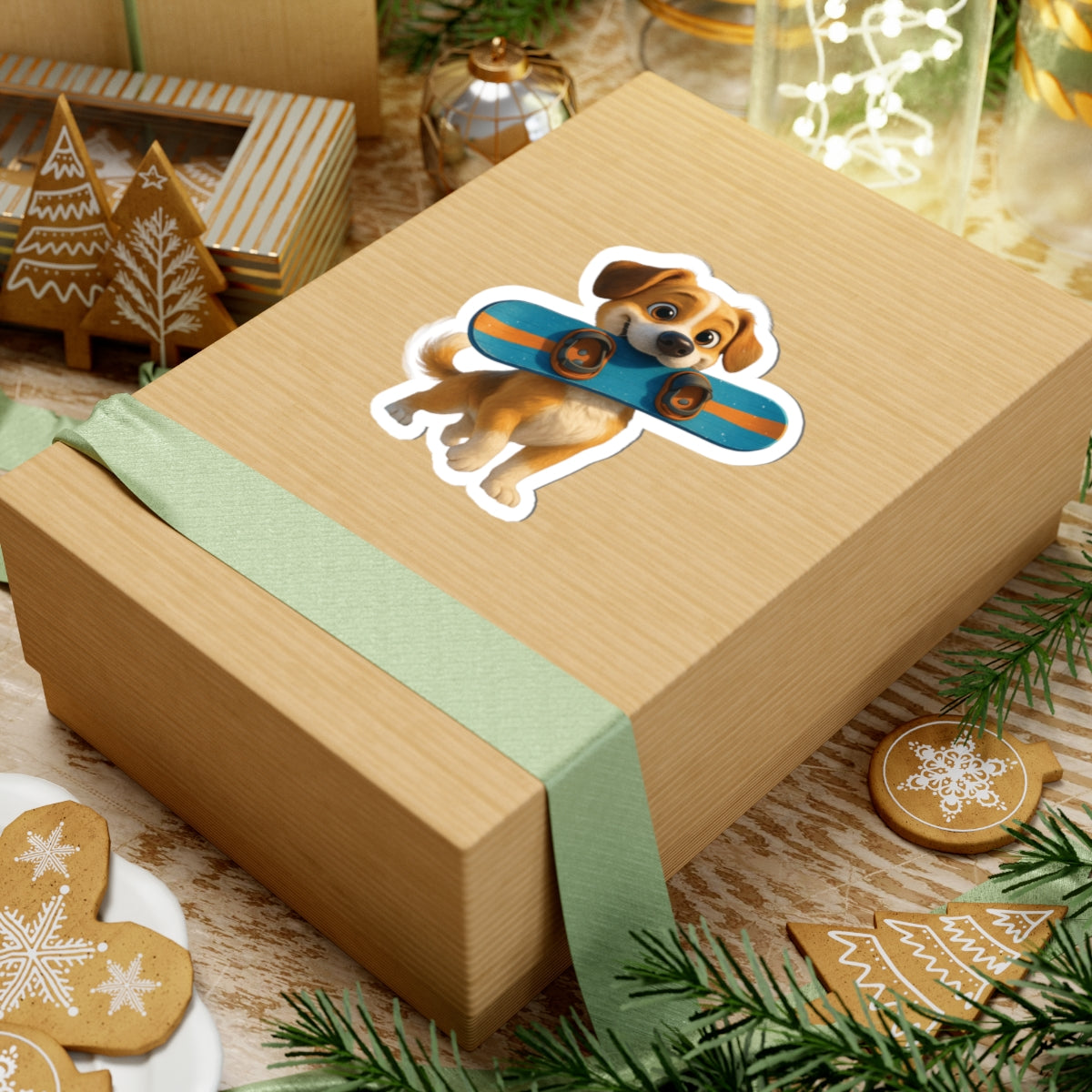 Bright-eyed and full of mischief, this glossy kiss-cut sticker captures a playful pup proudly carrying a colorful skateboard. Stick it on a laptop, journal, or water-resistant surface to add a cheerful pop of color and personality. The vibrant eco-solvent inks keep the art looking fresh while the smooth, scratch-resistant finish holds up to everyday handling. Lightweight and easy to apply, this sticker brings a small moment of joy whenever you see it — a tiny companion for commuters, students, and anyone who loves whimsical animal art.
