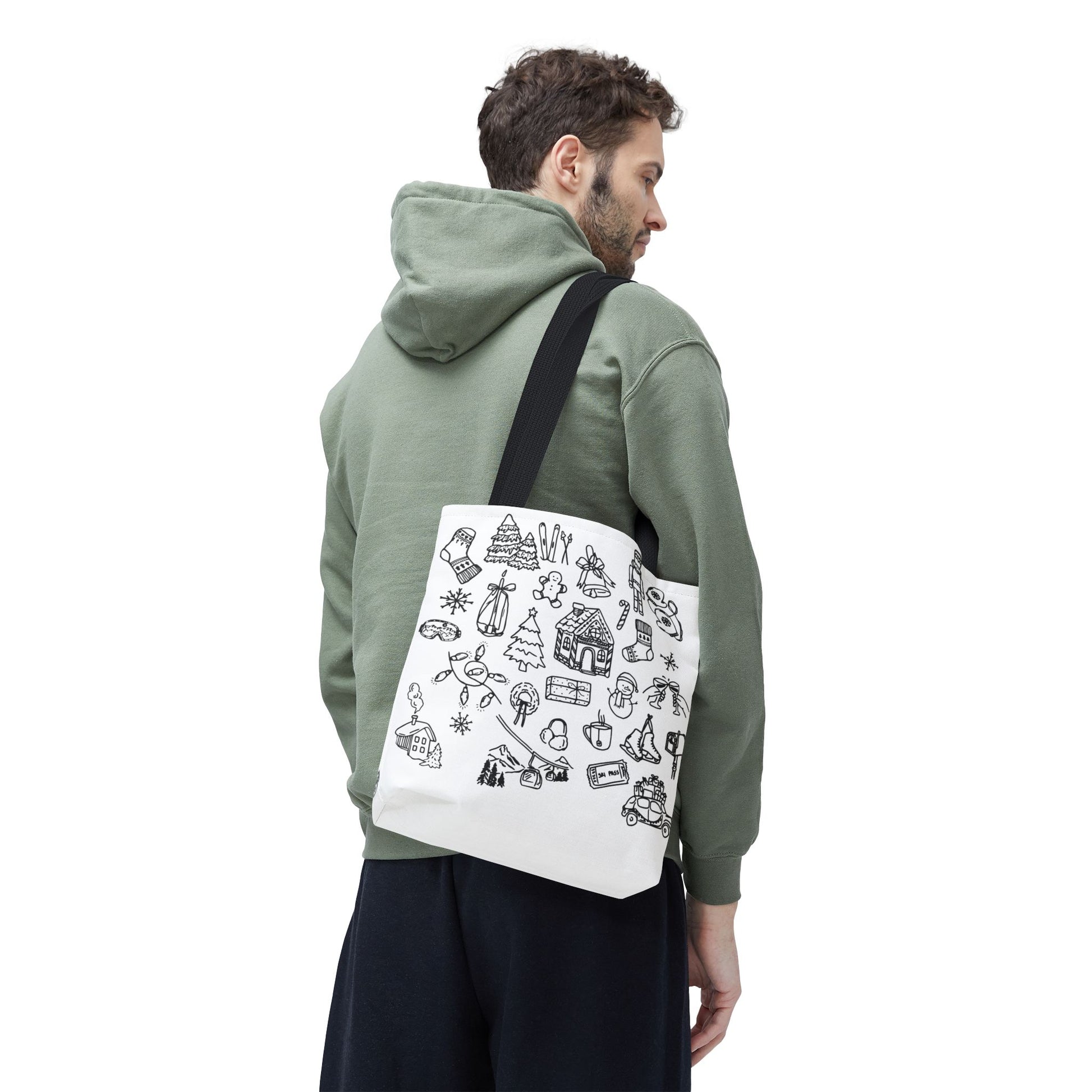 A roomy, everyday tote with hand-drawn winter doodles scattered across a clean white background. The lightweight polyester body holds its shape and dries fast after snowy commutes. Boxed corners add depth for groceries or a bulky sweater, while reinforced stitching at the handles keeps everything secure when you’re carrying a stack of books or holiday market finds. The monochrome sketch style reads cozy and playful — like pages from a pocket notebook — and the colored-handle options let you add a tiny personal accent. Carry it to seasonal markets, neighborhood strolls, cookie exchanges, or tucked over a shoulder on a last-minute gift run.