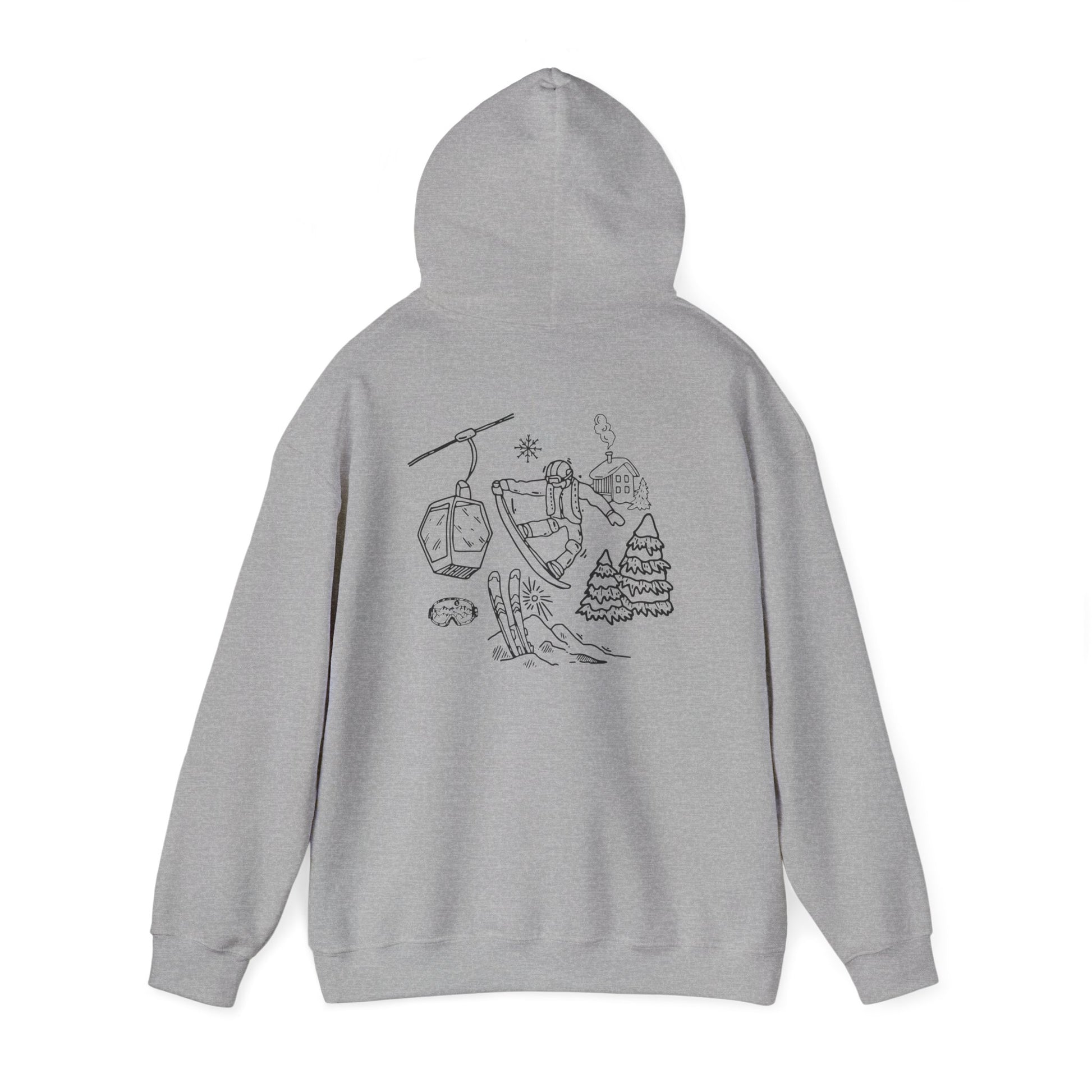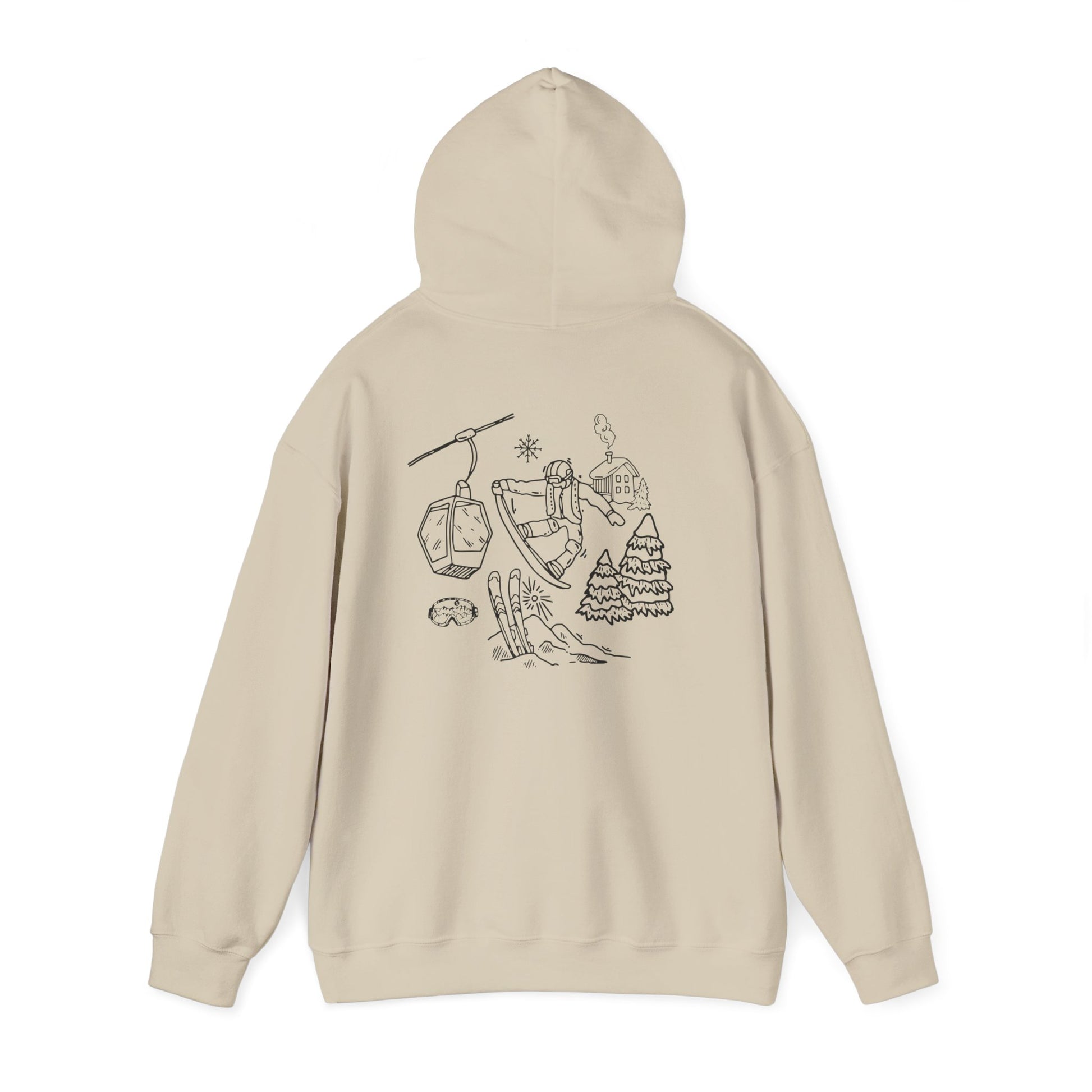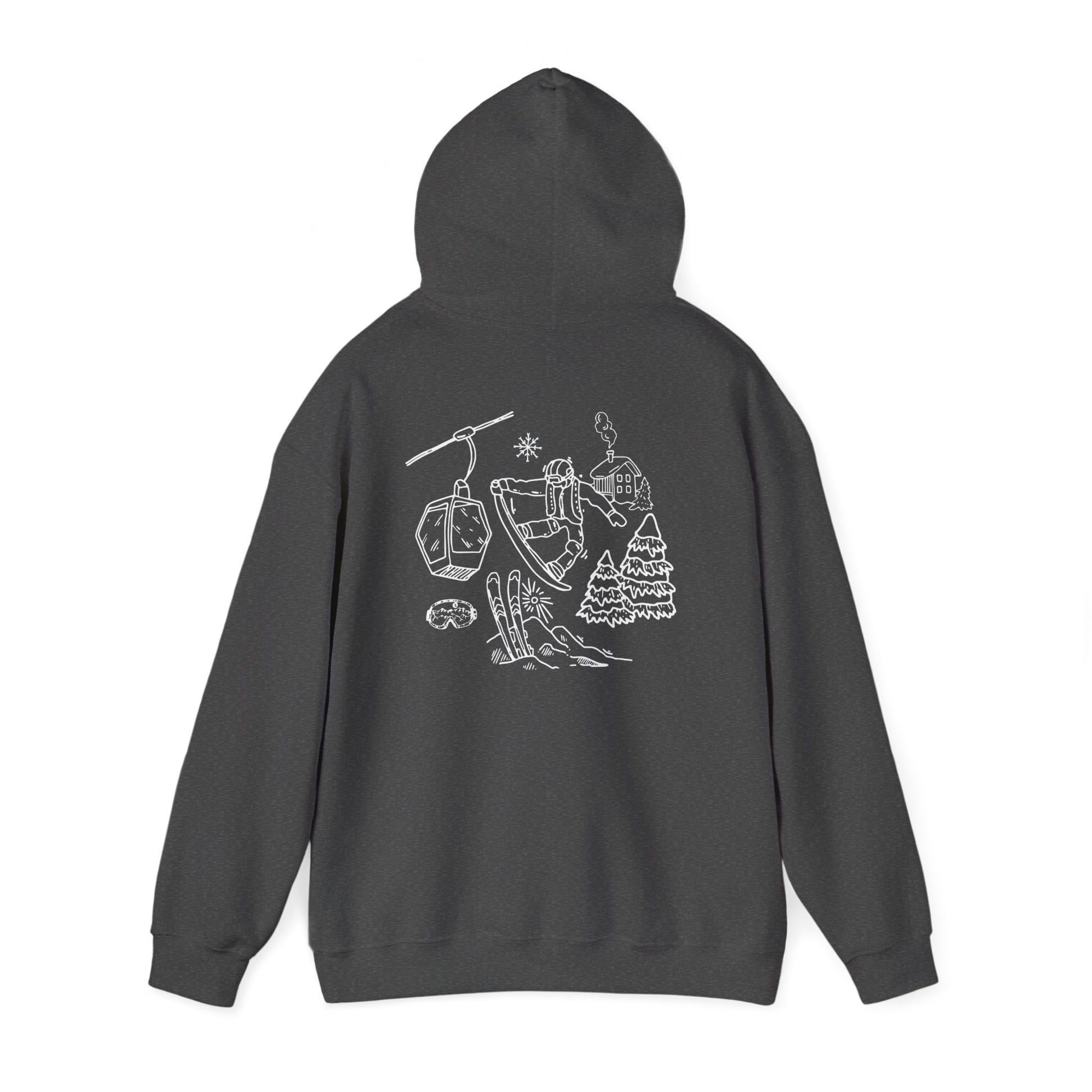 Soft, cozy, and quietly adventurous — this hoodie carries a hand-drawn ski-lodge scene that feels like a breath of cold mountain air. Lightweight lines of the lift, skis, goggles and layered pines sit small on the chest and spread into a calm, sketch-style tableau across the back. Slip it on after a day on the slopes or while planning the next trip; it holds warmth without weight and keeps the mood easy and intentional. The roomy pouch and double-lined hood make it a go-to layer for chilly mornings, cabin evenings, and slow drives home with a thermos at hand.