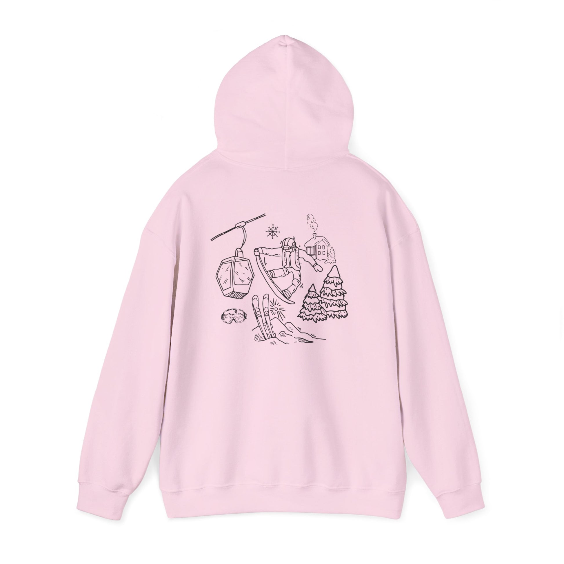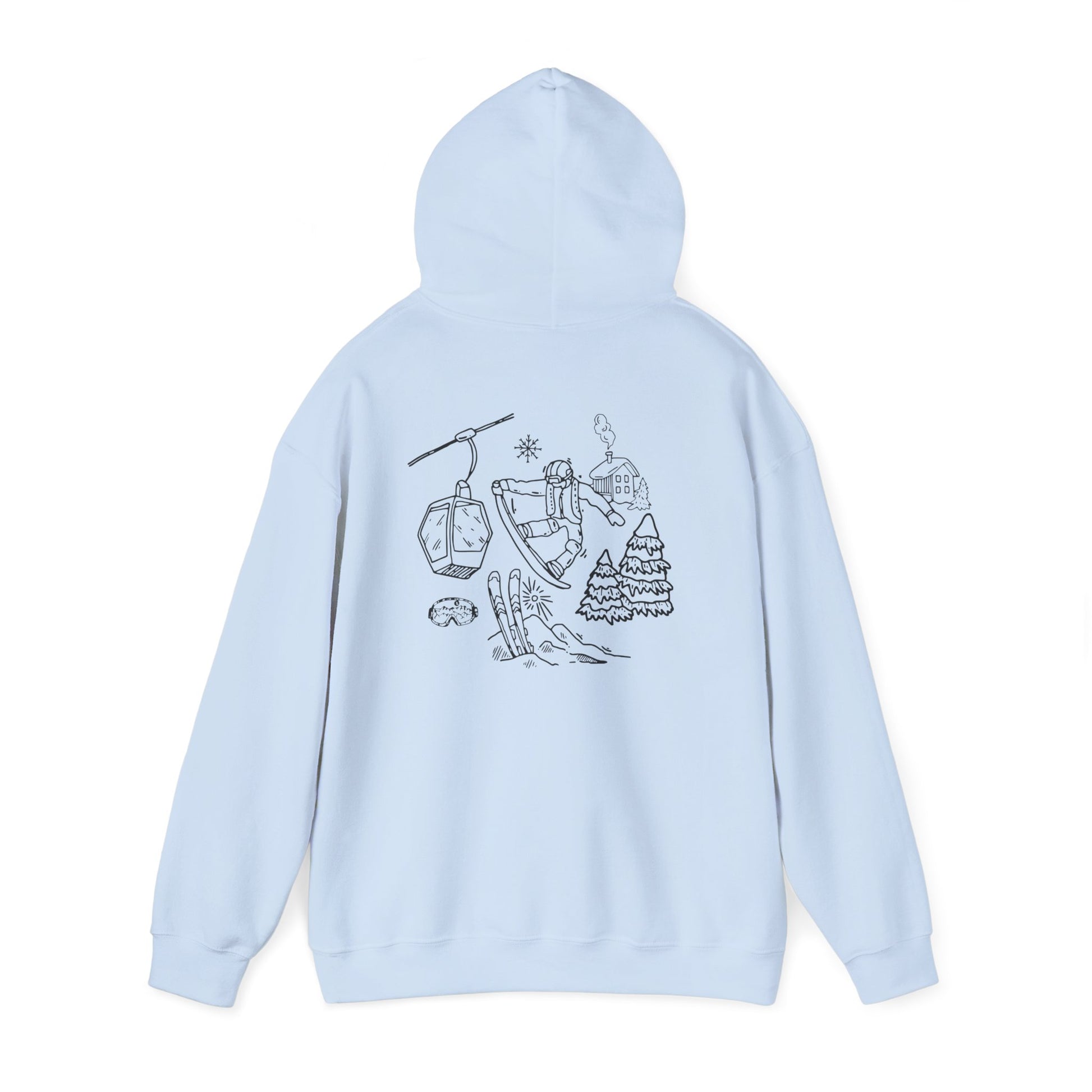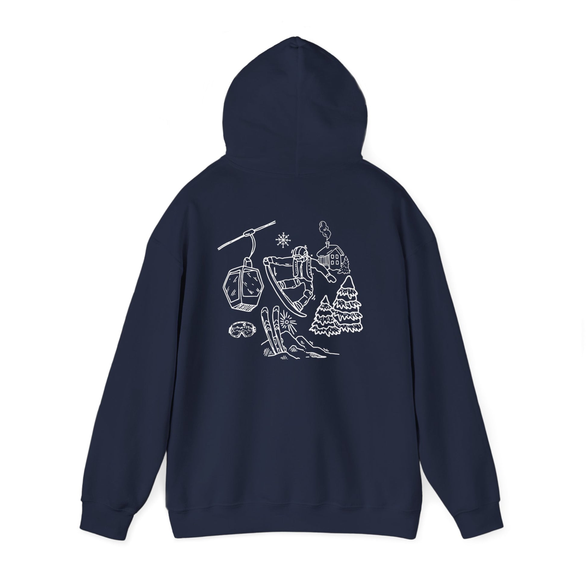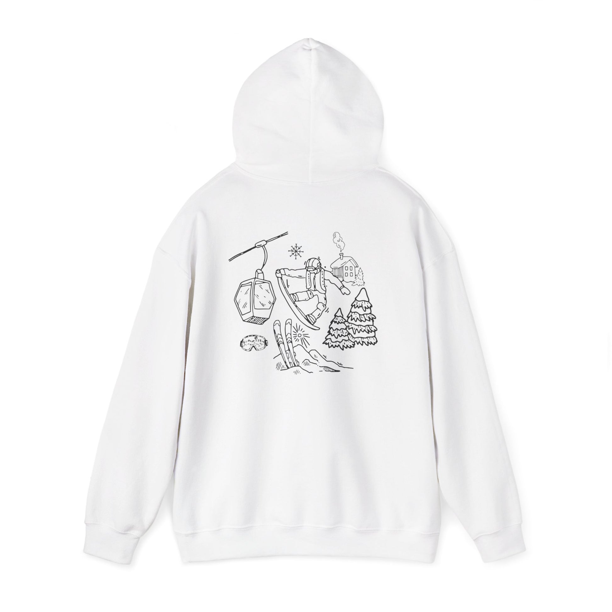 Soft, cozy, and quietly adventurous — this hoodie carries a hand-drawn ski-lodge scene that feels like a breath of cold mountain air. Lightweight lines of the lift, skis, goggles and layered pines sit small on the chest and spread into a calm, sketch-style tableau across the back. Slip it on after a day on the slopes or while planning the next trip; it holds warmth without weight and keeps the mood easy and intentional. The roomy pouch and double-lined hood make it a go-to layer for chilly mornings, cabin evenings, and slow drives home with a thermos at hand.