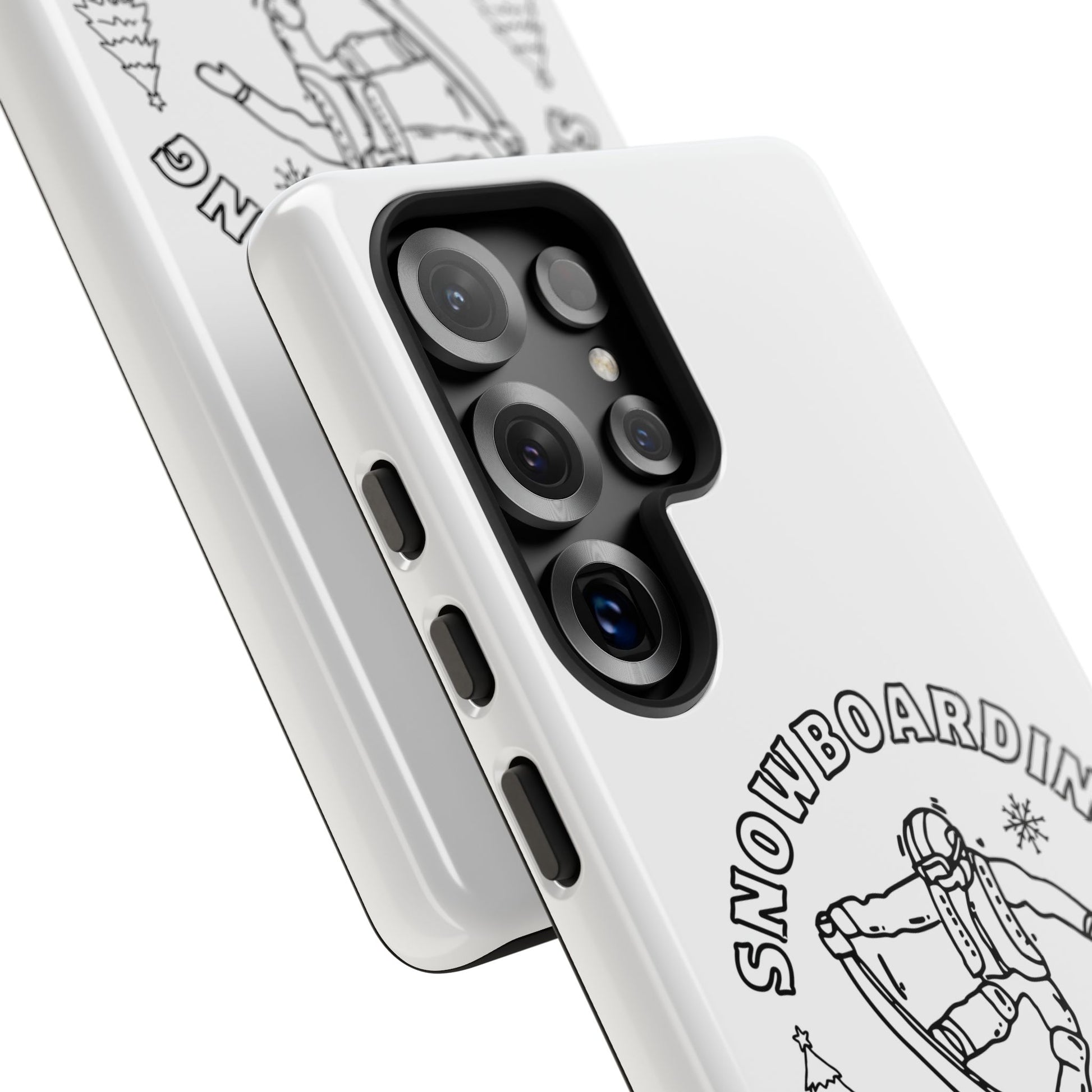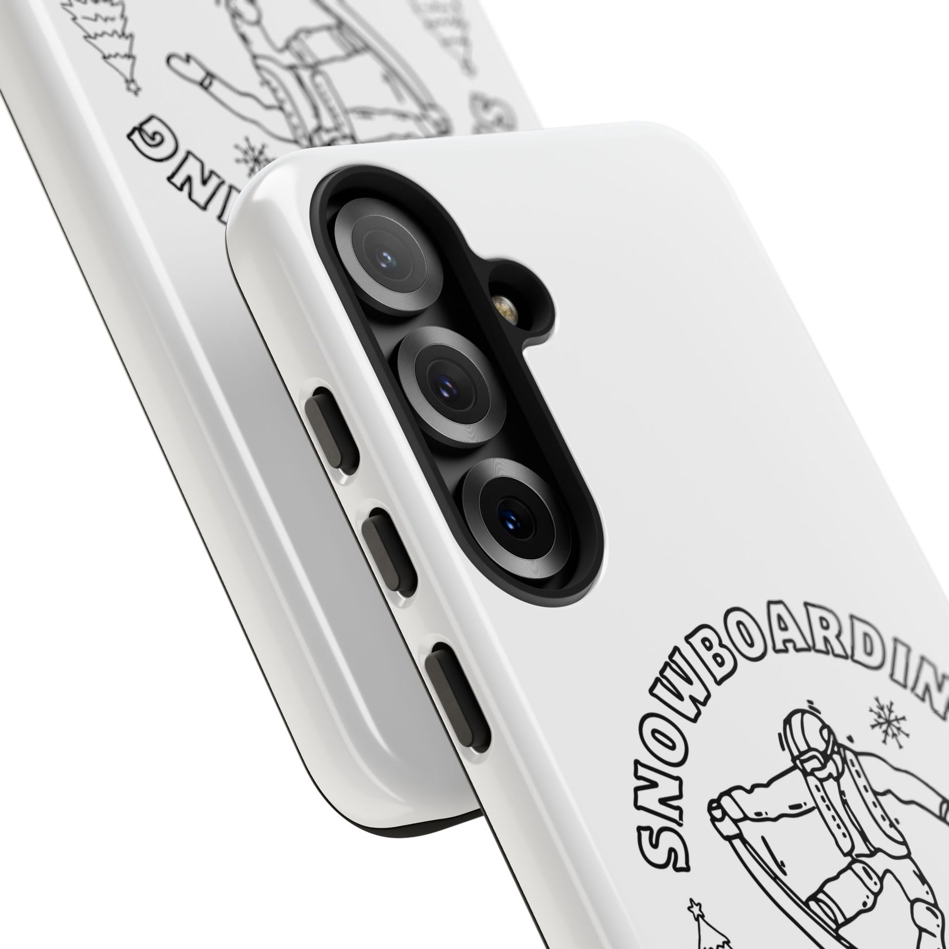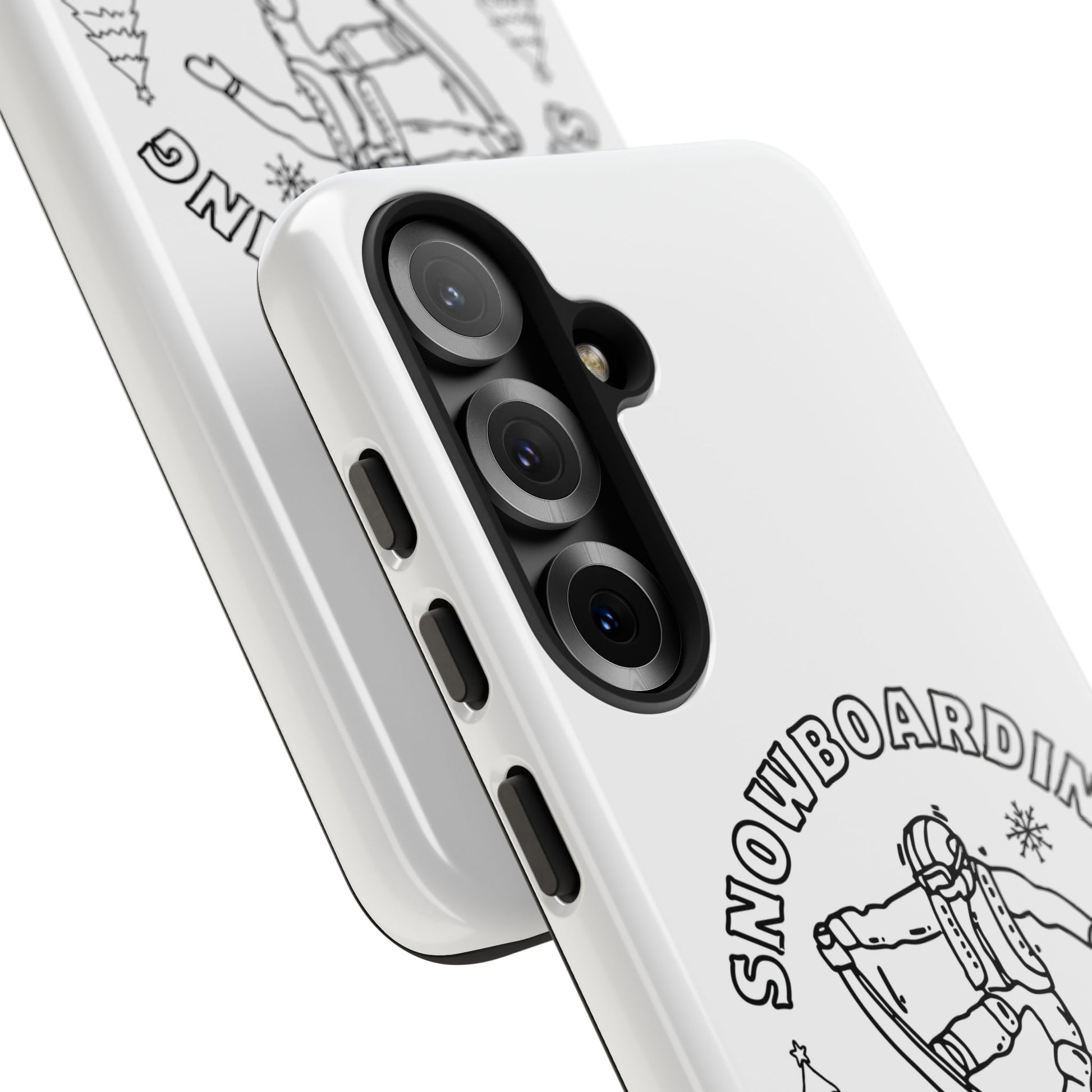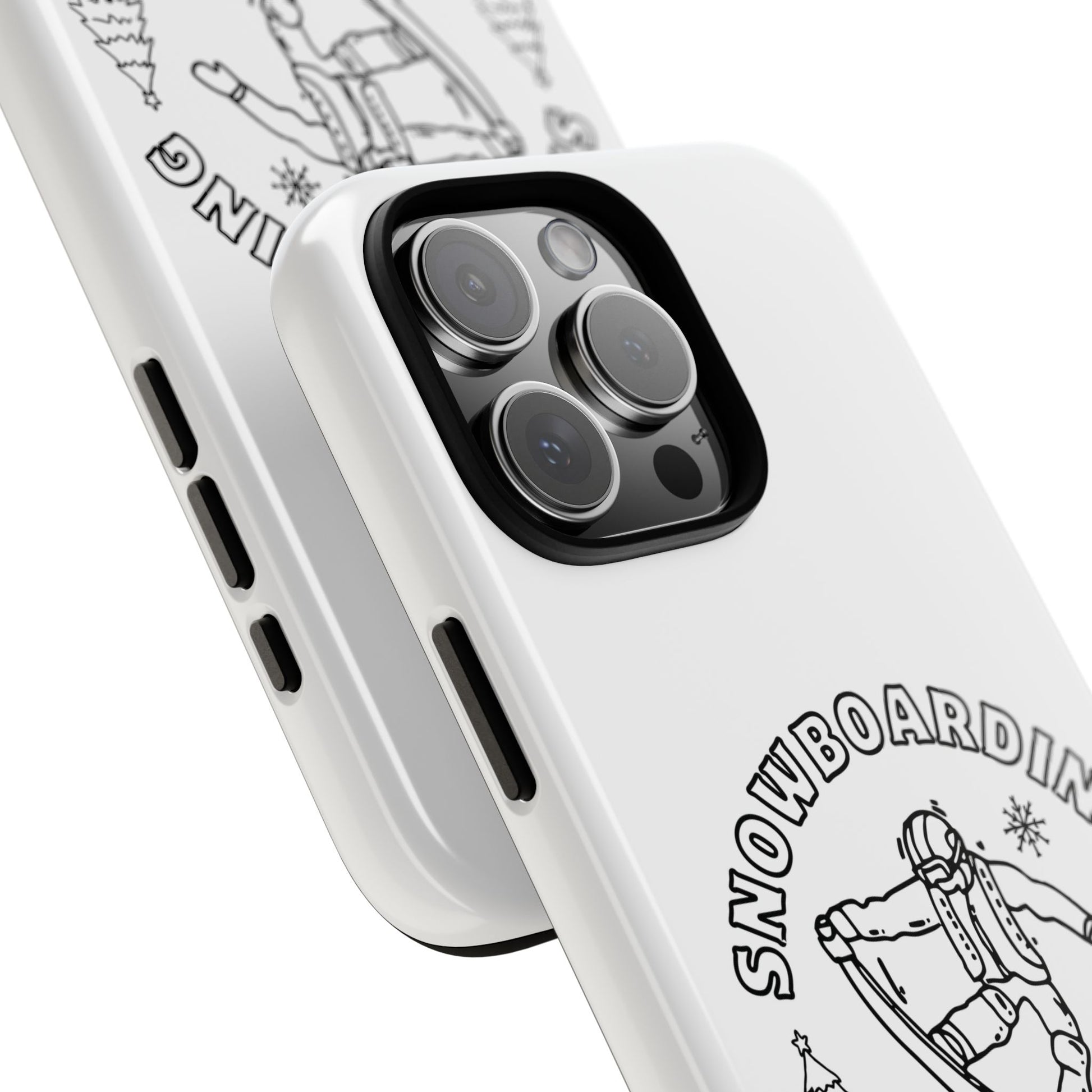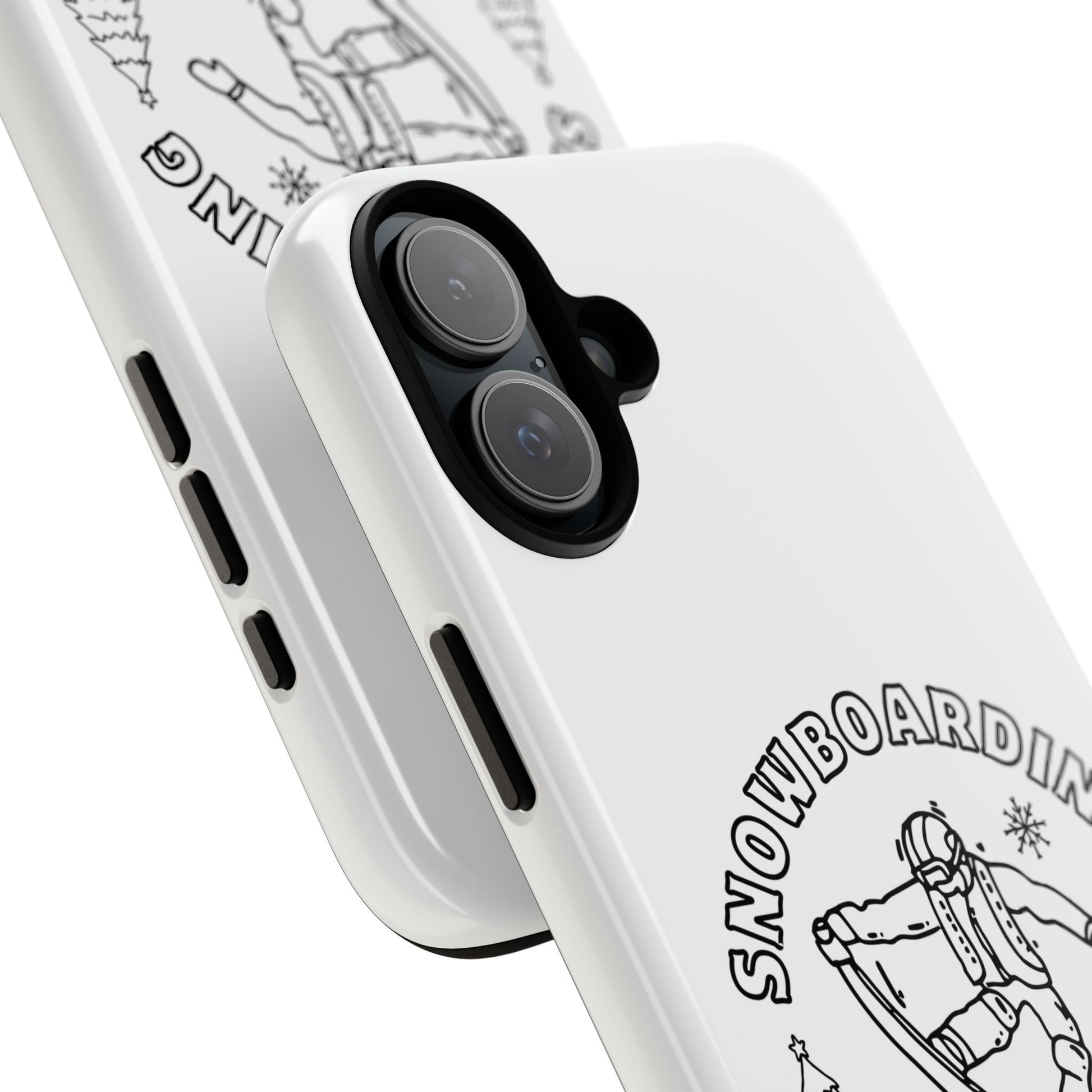 Carry a slice of the mountain with you. This tough phone case wraps a crisp, hand-drawn snowboarding emblem around a dual-layer shell — a rider carving through powder framed by trees, goggles and mittens. It feels solid in hand, shields against drops, and resists UV fading so the artwork stays clear through seasons of travel and trailhead selfies. Slip it on before a cold-weather road trip or keep it as your everyday reminder of wind-in-your-face runs and lift-line chatter. The glossy finish keeps the linework clean and minimal, matching tight layers, rugged gloves, and the casual gear of people who chase fresh tracks.