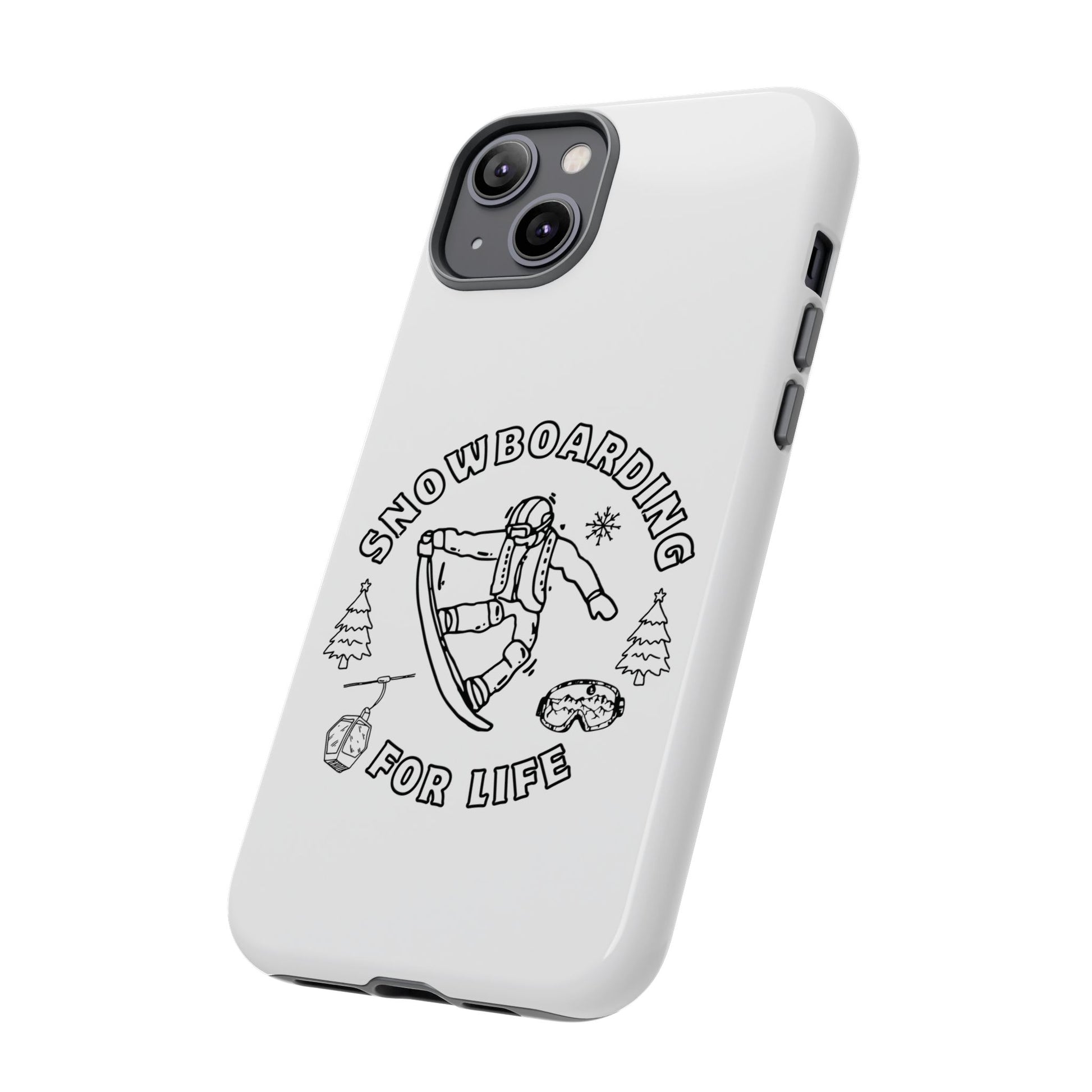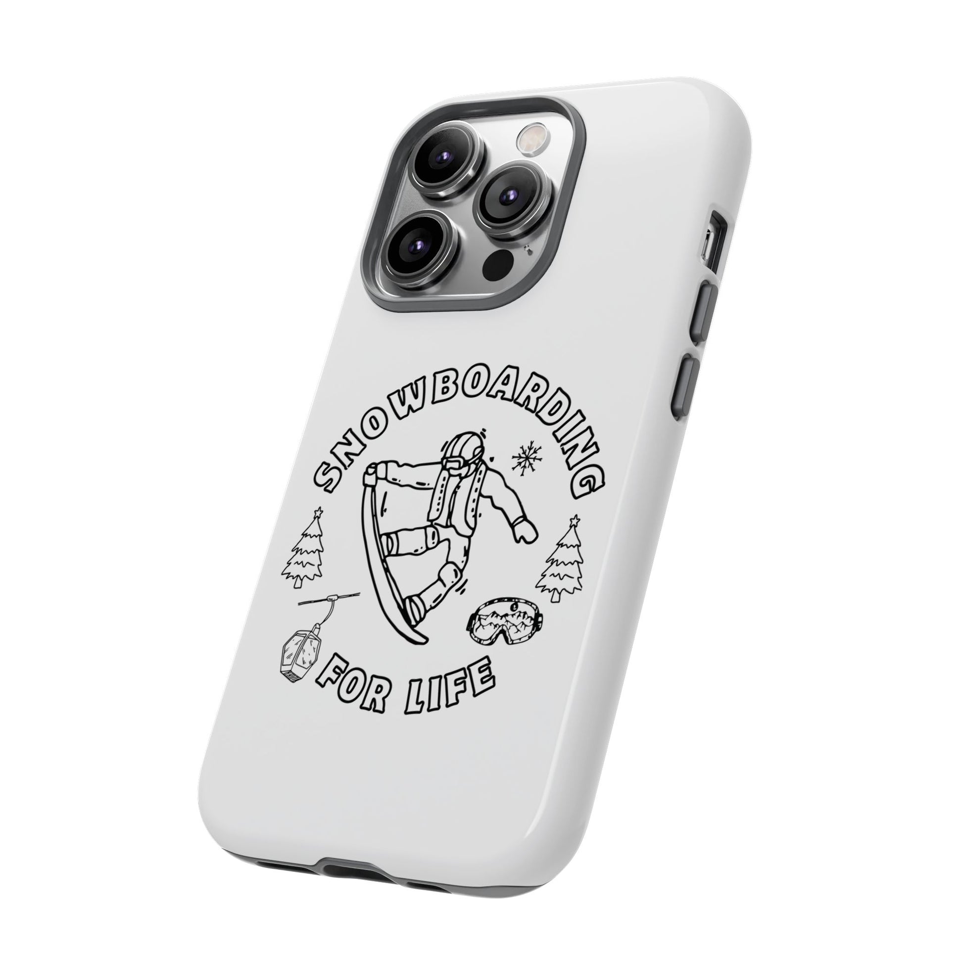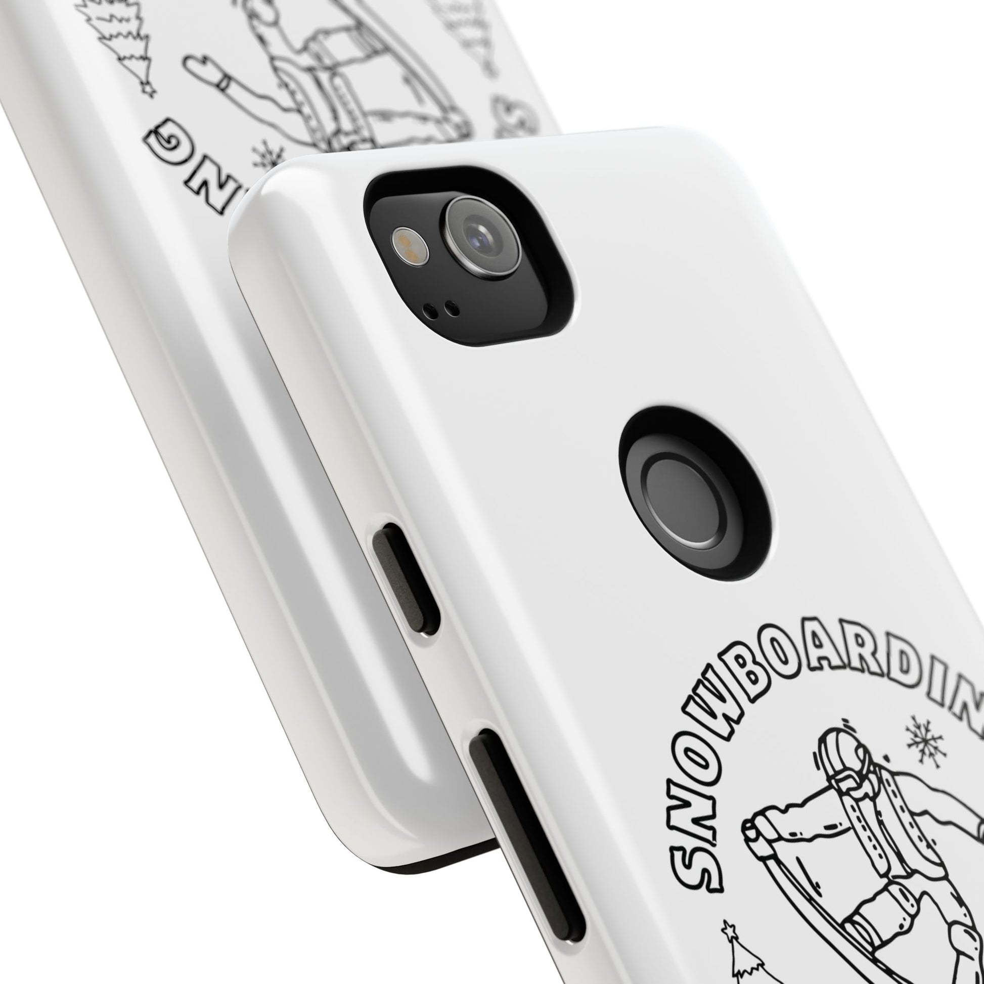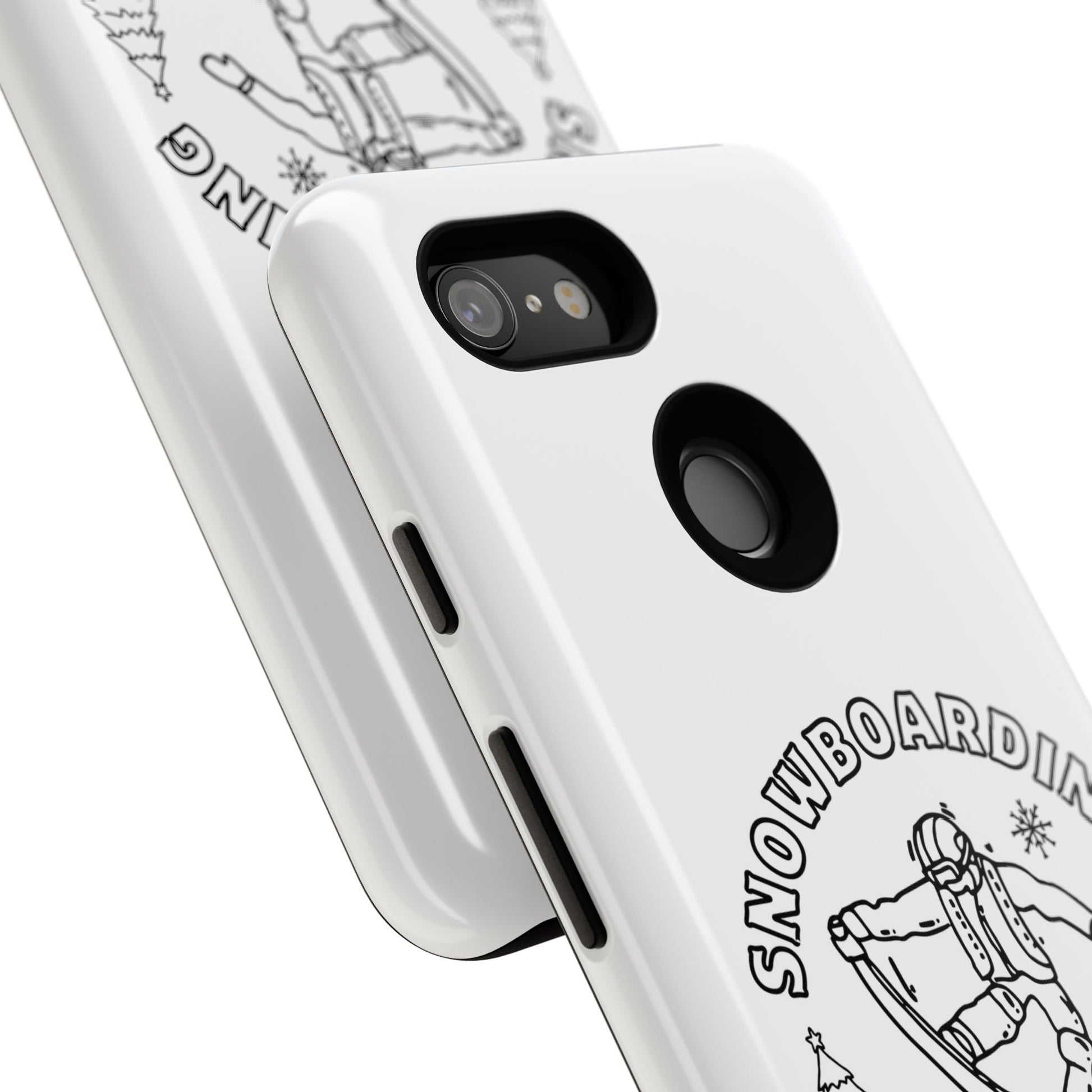 Carry a slice of the mountain with you. This tough phone case wraps a crisp, hand-drawn snowboarding emblem around a dual-layer shell — a rider carving through powder framed by trees, goggles and mittens. It feels solid in hand, shields against drops, and resists UV fading so the artwork stays clear through seasons of travel and trailhead selfies. Slip it on before a cold-weather road trip or keep it as your everyday reminder of wind-in-your-face runs and lift-line chatter. The glossy finish keeps the linework clean and minimal, matching tight layers, rugged gloves, and the casual gear of people who chase fresh tracks.